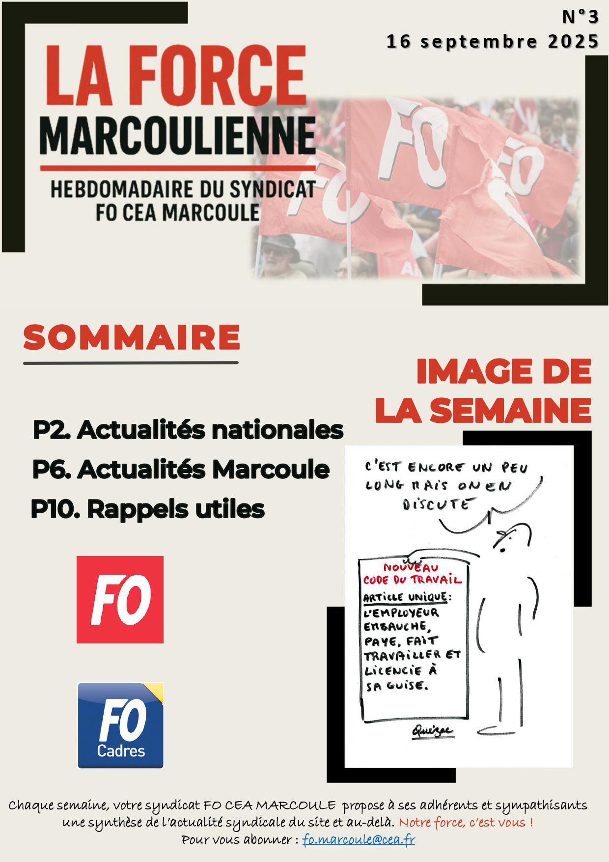 Chaque semaine, votre syndicat FO CEA MARCOULE propose à ses adhérents et sympathisants une synthèse de l’actualité syndicale du site et au-delà.